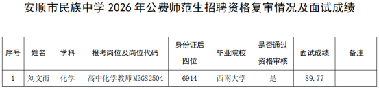 根據(jù)《安順市民族中學2026年公開招聘公費師范生公告》,現(xiàn)將參加安順市民族中學2026年公開招聘公費師范生面試人員現(xiàn)場資格審核情況及面試成績予以公示。
